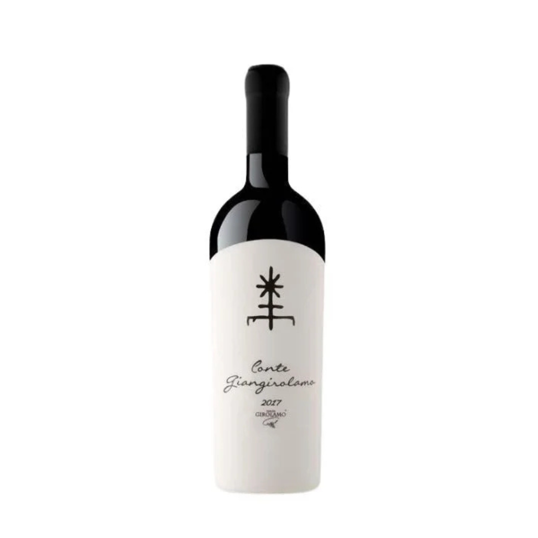 Il Conte Giangirolamo della cantina Tenute Girolamo nasce da un blend di Primitivo per il 50% e Negroamaro per l’altro 50%. Tutte le uve sono coltivare nei vigneti di proprietà che si trovano nella Valle d’Itria in Puglia, a 450 metri sul livello del mare. Qui il terreno è calcareo ricco di terra rossa.